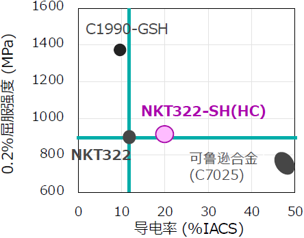 NNKT322(HC)是保持原来NKT322的构成,进行了制造工艺改良,保持高强度下,提升导电性的钛铜。