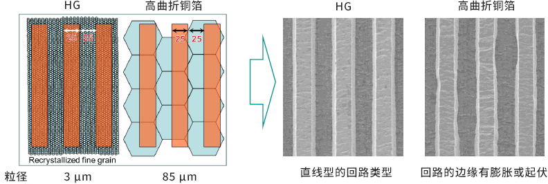 由于HG铜箔具有微细再结晶晶粒,因此在Fine Pitch性能(线路直线性)方面表现优异