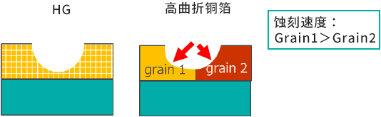 尽管各结晶粒的蚀刻速度不同,但HG铜箔的结晶粒与回路宽度相比十分微小,因此相邻结晶粒的蚀刻差异会变小。