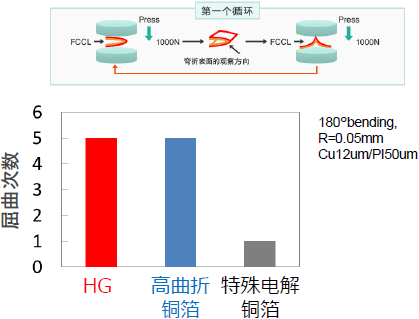 HG铜箔在反复弯折(即对折)测试中,表现出与高耐弯曲铜箔相当的性能。采用下述方法对FCCL进行了180°反复弯折试验,结果显示:特殊电解铜箔在第2个循环时便出现裂纹,而HG铜箔与高耐弯曲铜箔则在第5个循环前都未出现裂纹。