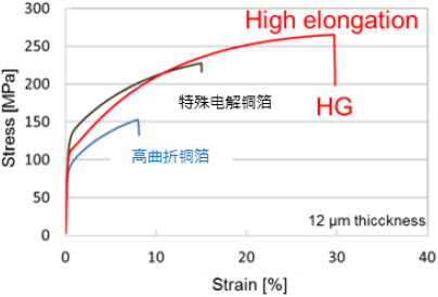 与其他铜箔相比,HG铜箔在应力-应变曲线(S-S曲线)中塑性区的斜率更大,具有不产生颈缩、实现均匀变形的特性。此外,HG铜箔的延伸率也高于其他铜箔。正因为具备这些特性,在对折过程中铜箔能够均匀且大幅度地变形,从而不易产生导致裂纹的“颈缩”(即局部截面积减小)现象。