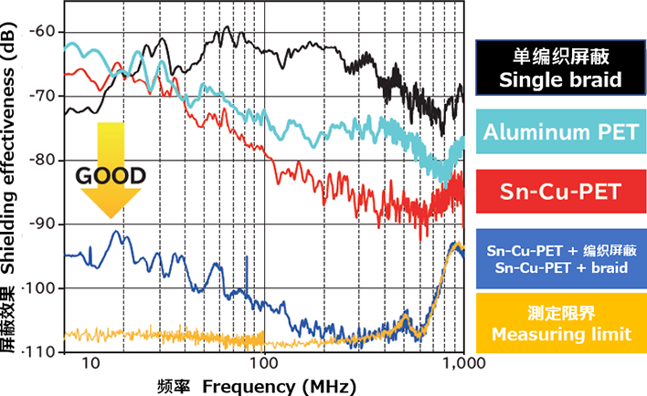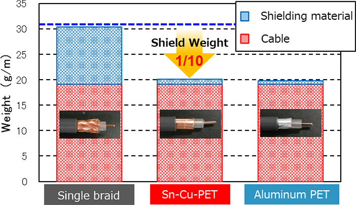 - 与编织相比,屏蔽材料的重量可以减轻至约1/10。
