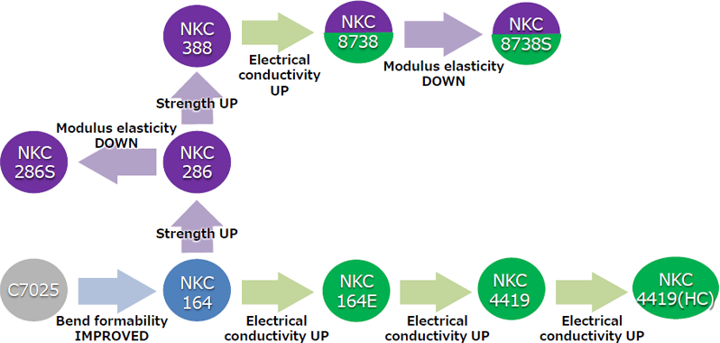 | Copper Alloy Name | C7025 | NKC164 | NKC286 | NKC286S | NKC388 | NKC8738 | NKC8738S | NKC164E | NKC4419 | NKC4419 (HC) |