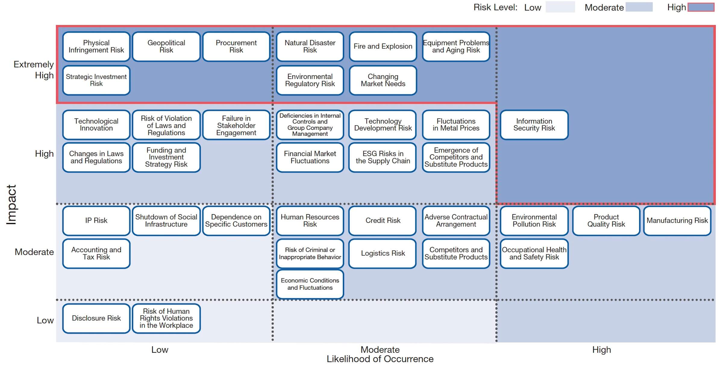 Management and business risks that are selected by the Executive Council as risks that could have a significant impact on the management of the JX Advanced Metals Group. The Executive Council approves and monitors risk response.
