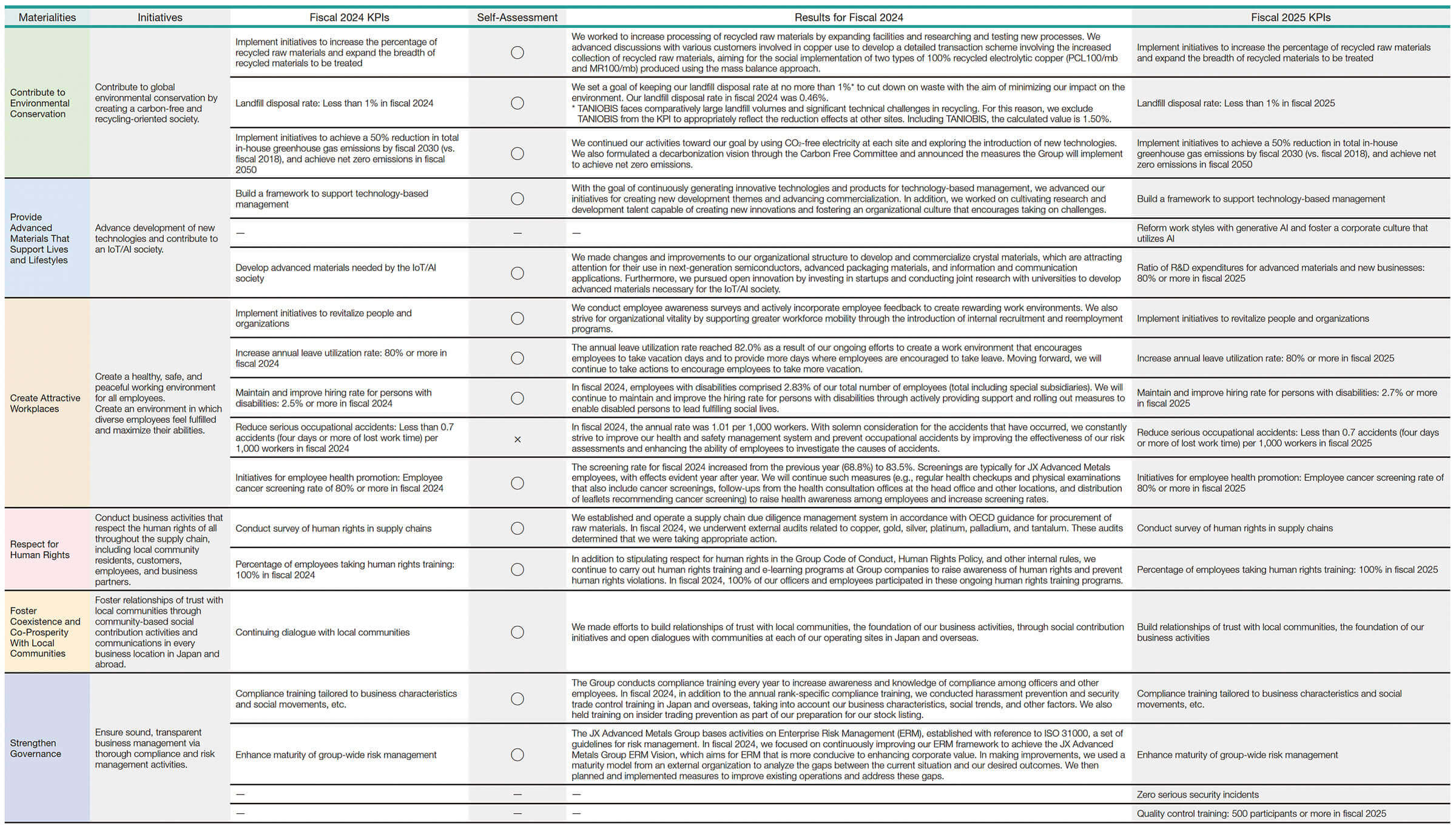 The JX Advanced Metals Group has identified six materialities for priority action to realize our 2040 Long-Term Vision. KPIs have been set for each materiality, and the Sustainability Committee, chaired by the president, administrates this system, measuring and assessing levels of achievement for these KPIs.
