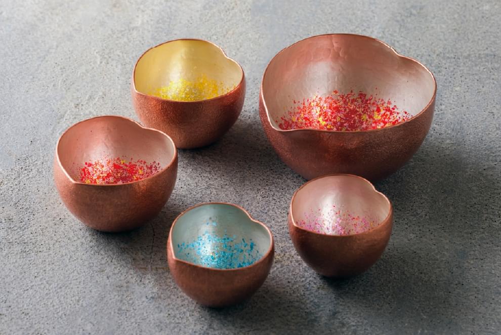 ひとつひとつ心を込めて打ち出した愛らしいハートの形は、唯一無二の存在感を放ちます。銅の柔らかな輝きと、底に施された箔の煌めきは、お酒を注ぐたびに異なる表情を見せ、日々に小さな感動と光をもたらします。日常に寄り添う作品として、日々の暮らしに温もりと幸せを添え、長く愛されることで未来へと繋がる価値を創造します。