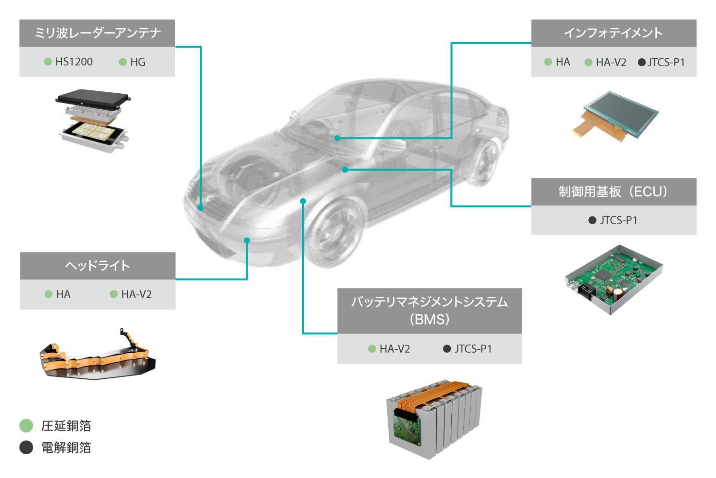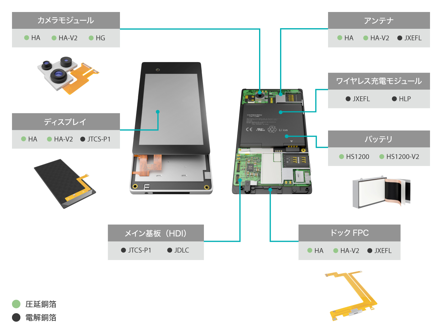 電解銅箔は、微細配線基板向けの銅箔やフレキシブルプリント基板向けの銅箔など、多彩なラインナップでお客様のご要求に応えてまいります。