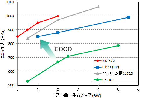 NKT322はチタン銅に少量のFeを添加し、更に工程改善を加えて開発した当社のオリジナル合金です。通常のチタン銅に比べて強度と曲げ加工性を格段に向上させております。