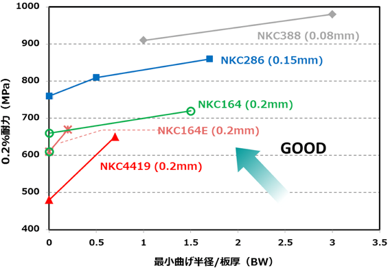 NKC388は従来のコルソン系銅合金の強度-導電率-曲げ加工性のバランスを損なうことなく、従来品とは一線を画した強靭化に成功した合金です。