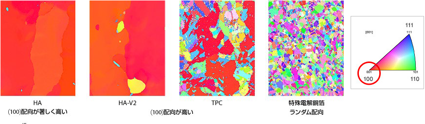 HA、HA-V2箔はアニール後の結晶が大きく、かつ結晶方位が100方向に著しく高くなるよう設計されています。これらの特徴がグラフェンのエピタキシャル成長に影響し、高品質なグラフェンを生成することができます。