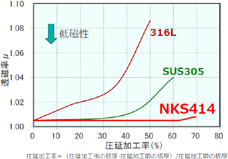 | NKS414 | 17Cr-14Mn-4Ni-Fe | 高強度、非磁性 | 非磁性VCMヨーク 遮磁片等 |