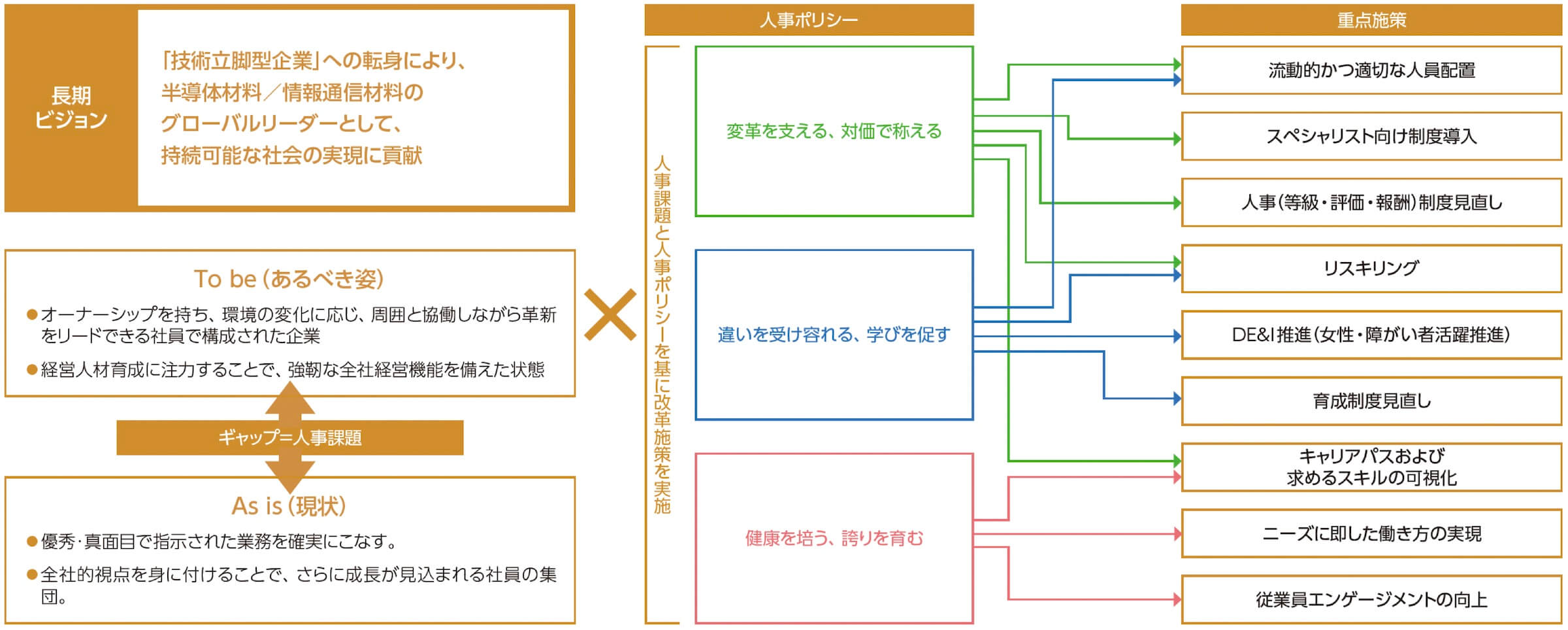 装置産業型企業から技術立脚型企業へと転身し、2040年長期ビジョンを実現するためには、「人」の力によるイノベーションが不可欠であり、「人」の意欲・能力を最大限引き出すことが経営上の重要課題です。こうした考えのもとで、各施策を立案する際の判断の拠り所とするべく、これからも大切にしていきたいものと、今後新たに変えていきたいもの双方を合わせて、「従業員に対する姿勢」としての人事ポリシーを新たに策定しました。当社グループではこの人事ポリシーに基づき、As is(現状)とTo be(あるべき姿)のギャップ(=人事課題)の解消に向けたさまざまな改革施策を展開しています。