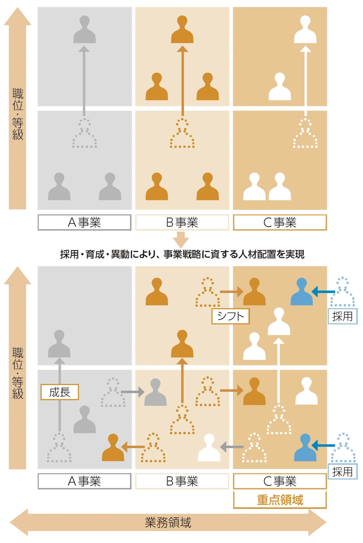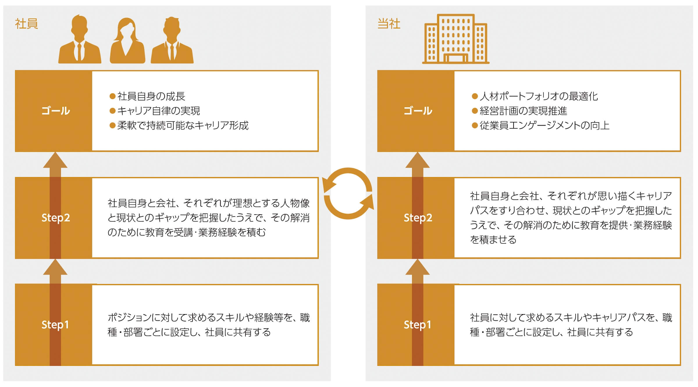 当社は2040年長期ビジョンの実現を目指し、人的資本価値の最大化を目的とした人材ポートフォリオマネジメントを推進しています。具体的には、事業戦略の実現に必要なポジションとその要件を定め、最適な人材を配置すべく戦略的な育成・登用や各種人事施策を行います。また、組織の持続的な成長をより確実なものとするため、社員の自律的な意欲に基づく成長・価値発揮を促進するための取り組みも進めています。これらにより、人材の最適配置と成長支援の両立を図っています。