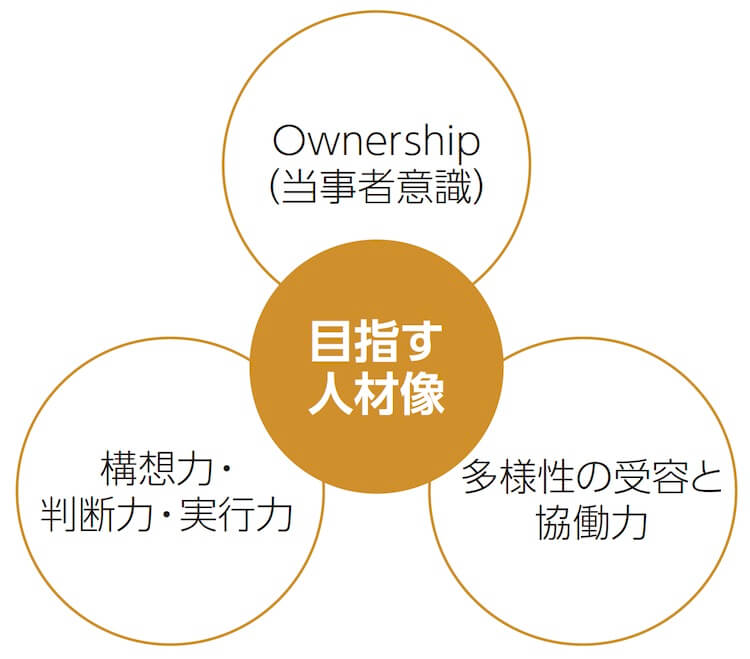 業務経験を育成の中心に据え、評価や教育等、総合的な人事施策により育成する。特に「異なる環境」における「実践型」の育成を推進することで、広い視野やタフな精神力、自ら考え行動するマインドを育てる。
