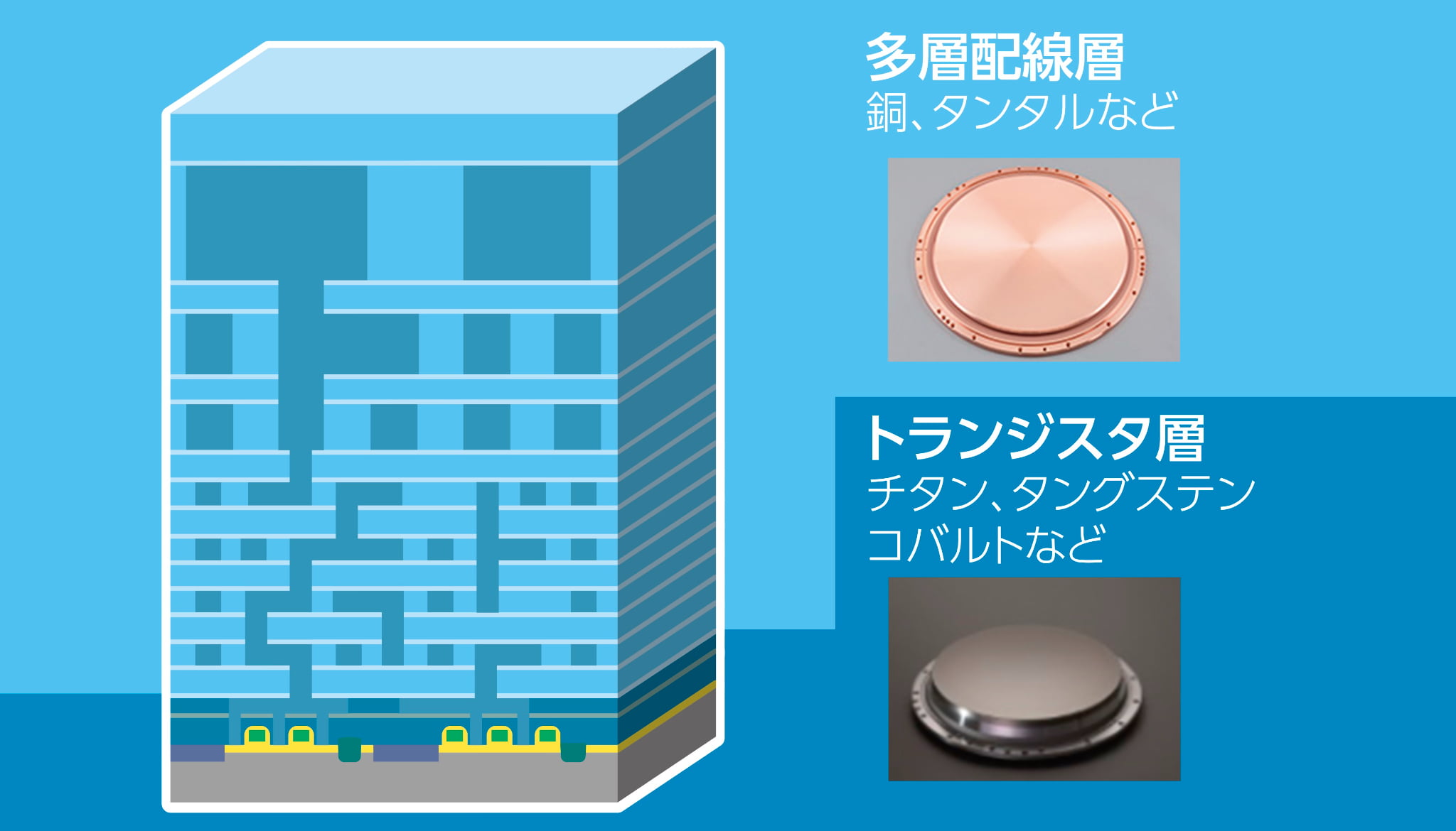 ロジック・メモリをはじめとする半導体内の配線を形成するために用いられる材料です。当社では銅をはじめ、タンタル、チタン、タングステン、コバルトなど、さまざまな種類のスパッタリングターゲットを提供しており、いずれの製品も世界No.1※のシェアを有しています。