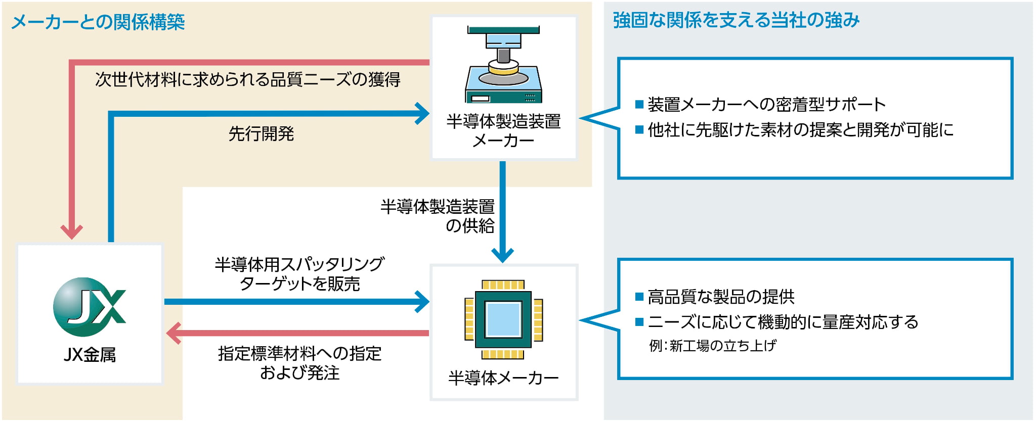 半導体メーカーおよび半導体製造装置メーカーとの強固な関係半導体用スパッタリングターゲット製品のビジネスモデルのイメージ