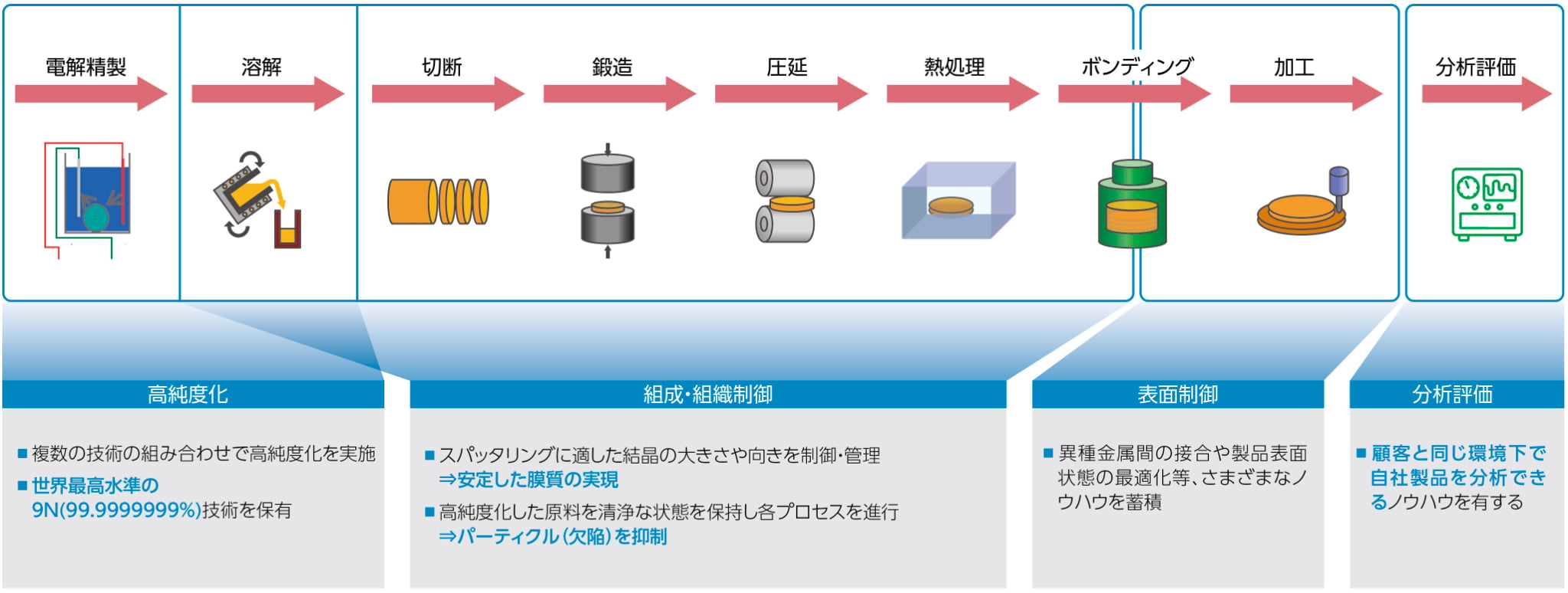 半導体用スパッタリングターゲットの製造に用いられる優れた技術半導体用スパッタリングターゲットの製造工程