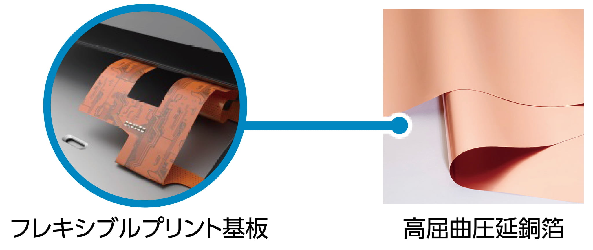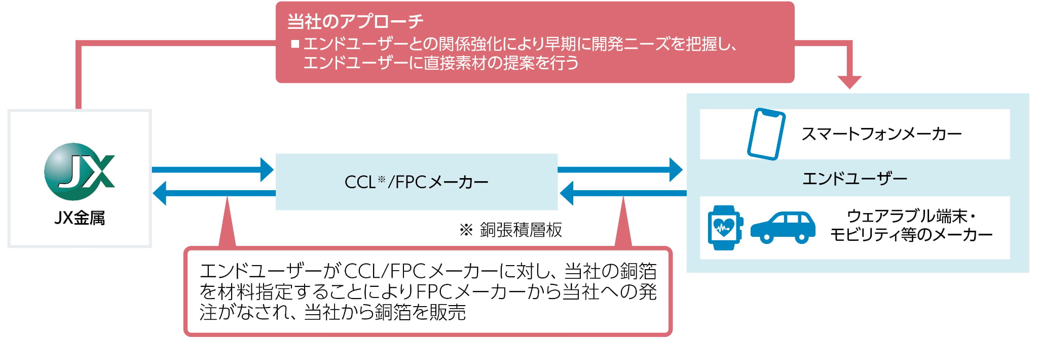 圧延銅箔は、スマートフォン内部の部品と部品をつなぐ折り曲げ可能な配線材料であるFPC(フレキシブルプリント基板)に用いられ、スマートフォンの小型化や長寿命化に貢献しています。今後は、AI搭載等によるスマートフォンやパソコン向け部材のさらなる高機能化・微細化に加え、スマートウォッチやスマートグラスといったウェアラブルデバイス等の周辺機器による使用拡大が見込まれます。当社では、エンドユーザーとの関係強化を通じて開発ニーズを早期に把握することで、競合他社に先駆けて製品の上市を行う「市場開発型アプローチ」により、1stベンダー※の地位を確保しています。