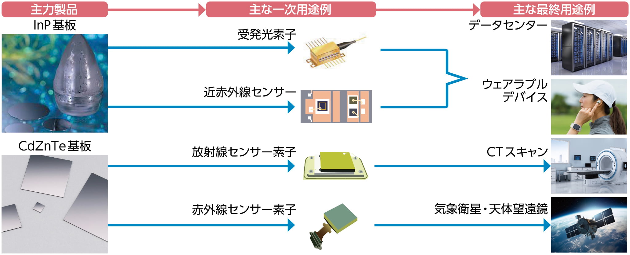 生成AIの急速な普及に伴うデータセンター数の増加や、モバイル通信量の増加、センシング技術の高度化等により、結晶材料分野の成長が見込まれています。当社の高純度化、組成制御、温度制御の技術を駆使し、高品質な結晶材料を市場に供給することにより、結晶材料を当社グループの次世代の収益の柱とするべく取り組みを進めています。その一環で、2024年4月に技術本部 結晶材料事業推進部を立ち上げ、データセンター等で使用される受発光素子の素材となるInP(インジウムリン)基板や、赤外線検出器や放射線検出器等の用途に用いられるCdZnTe(カドミウムジンクテルル)基板等の分野を強化する体制を構築しました。