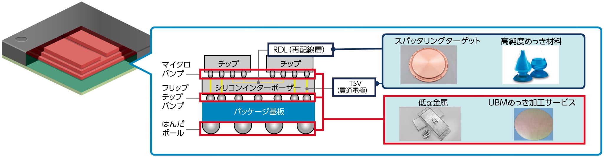 半導体パッケージング・実装分野での取り組み従来の技術の延長線上での半導体の高性能化への限界が語られる中において、CPUやメモリなど機能の異なる複数のチップを1つの基板上に高密度で実装することで、処理速度を大幅に向上させる「チップレット」などの後工程での技術革新に注目が集まっています。当社のスパッタリングターゲットは、チップレット間を縦や横につなぐ配線の材料としての需要の拡大が期待されます。また、これらの用途では、高純度なめっき用材料など、新たな材料のニーズの拡大も見込まれます。また、半導体を回路基板に実装するための材料などにおいても当社材料需要の拡大が期待されます。
