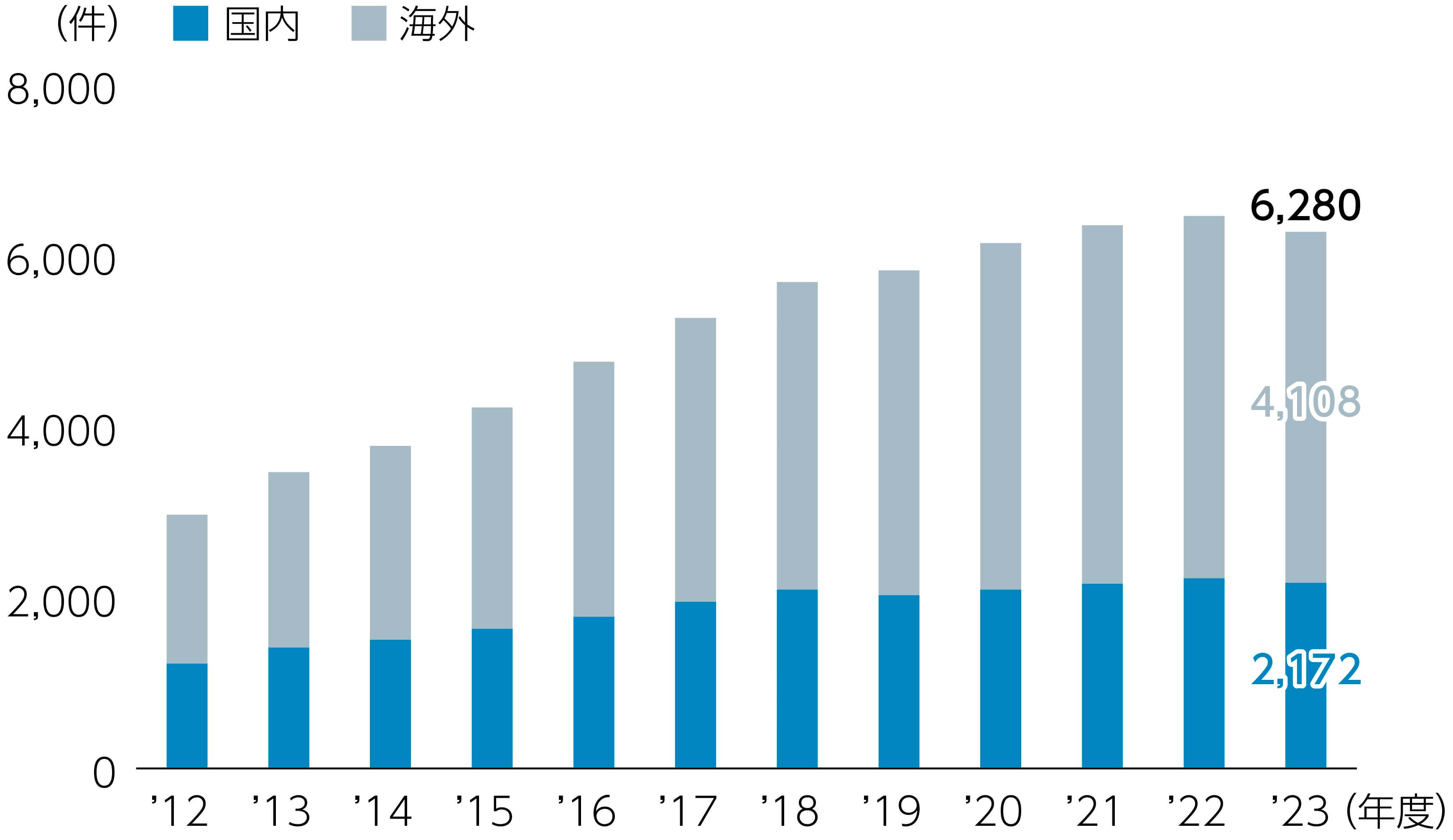 当社グループでは、特許法に従い、「職務発明の取扱いに関する規則」を制定しています。出願時および登録時の奨励金に加え、利益をあげた特許の発明者や優れた発明を考案した発明者を表彰する当社独自の制度を設け、開発および発明意欲を促し、技術立脚型の企業活動を推進しています。