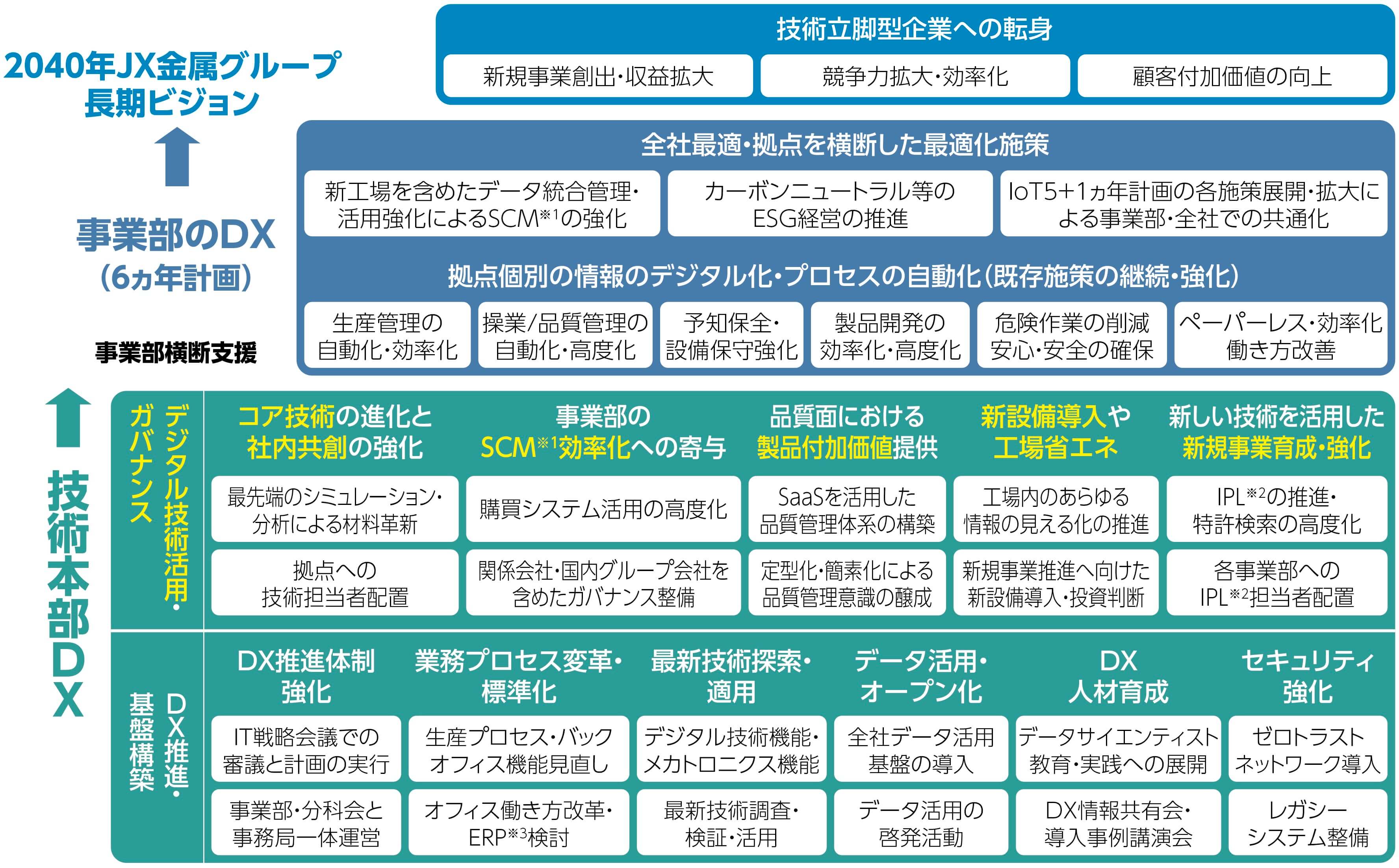 2040年JX金属グループ長期ビジョンに描いたあるべき姿「技術立脚型企業」の実現に向けた事業基盤の確立を目指し、各事業部・コーポレート部門での最適化・自動化施策の実施、それらを下支えする技術本部各部での新技術活用・全社横断的な施策などを通して、DXを推進しています。