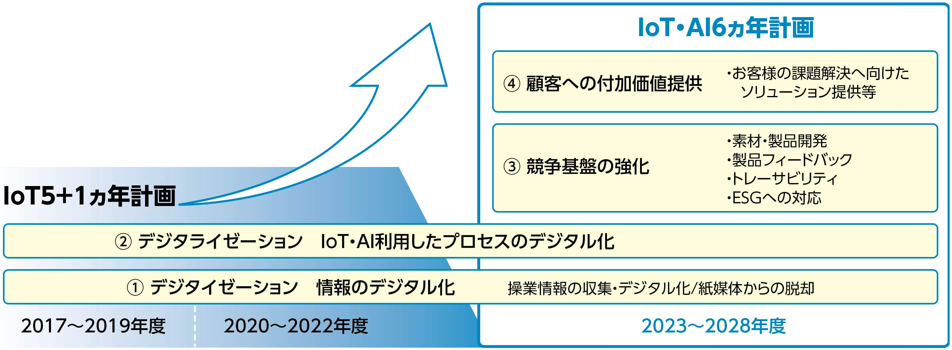 2017年より「IoT5+1ヵ年計画」を推進し、IoTやAIの活用を進めてきました。2023年度からは新たに「IoT・AI6ヵ年計画」 として、これまで取り組んできた情報のデジタル化(デジタイゼーション)やプロセスのデジタル化(デジタライゼーション)に加え、事業変化を踏まえたサプライチェーン全体の最適化、競争基盤の強化、お客様への価値創出、脱炭素をはじめとした ESGへの対応など領域を拡大し、DXのさらなる推進を図っていきます。