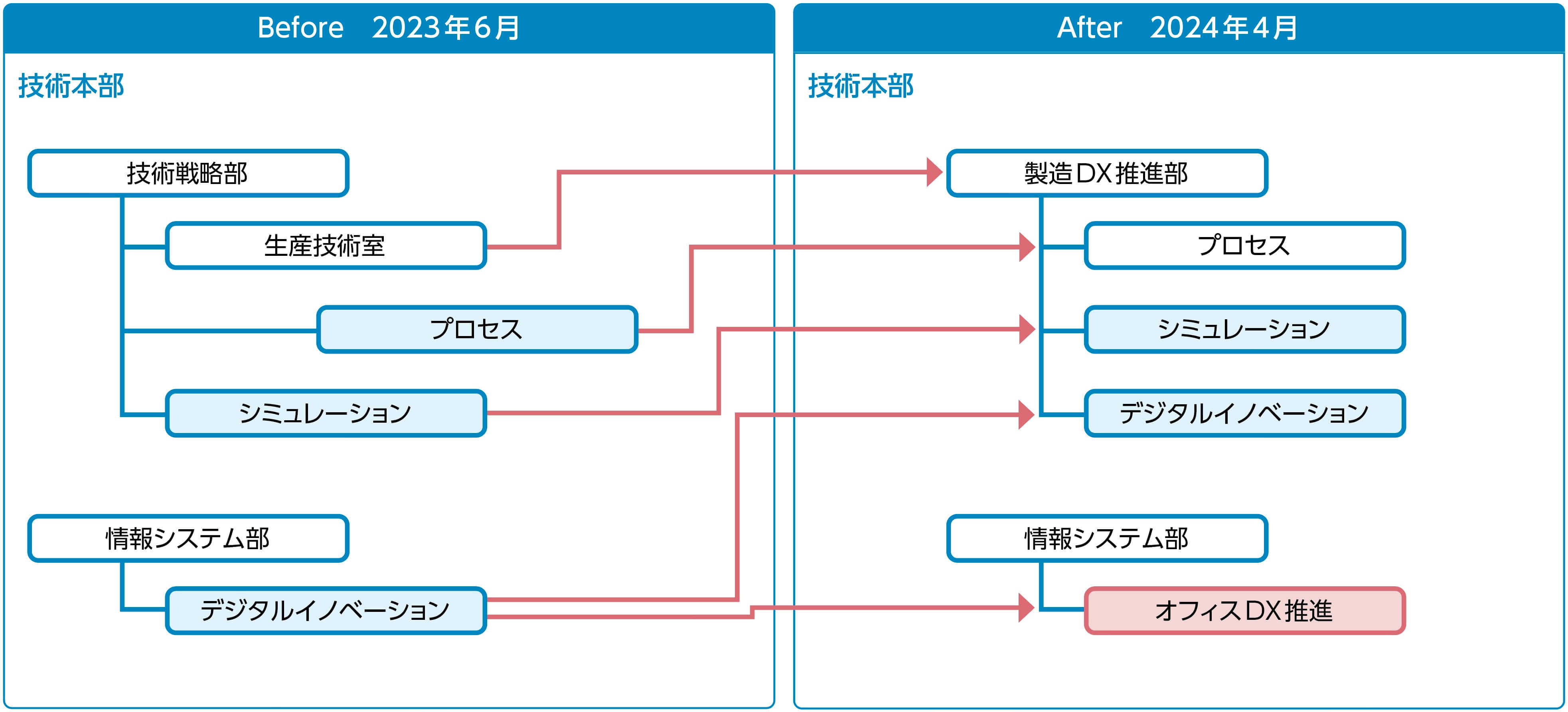 グループ内の生産技術を横断的に展開・活用し、グループ全体の生産プロセスの最適化およびそれに伴うキャッシュフロー改善を目指すことを目的に、2023年6月付で生産技術室を新設し、生産拠点の生産性改善に向けた取り組みを始めてきました。2024年4月からは同組織の機能に、これまで情報システム部が所管していたデータ解析・自働化技術と、技術戦略部が所管していたシミュレーション技術を統合し、新たに製造DX推進部を設置することにより、当社グループがこれまで各事業で培ってきた技術リソースを一元的に集約し、各事業の強靭化・効率化を一層推進していきます。また、情報システム部内にはオフィスDX推進機能を設置し、営業・事務系の生産性向上、生成AI活用による業務高度化などを推進していきます。