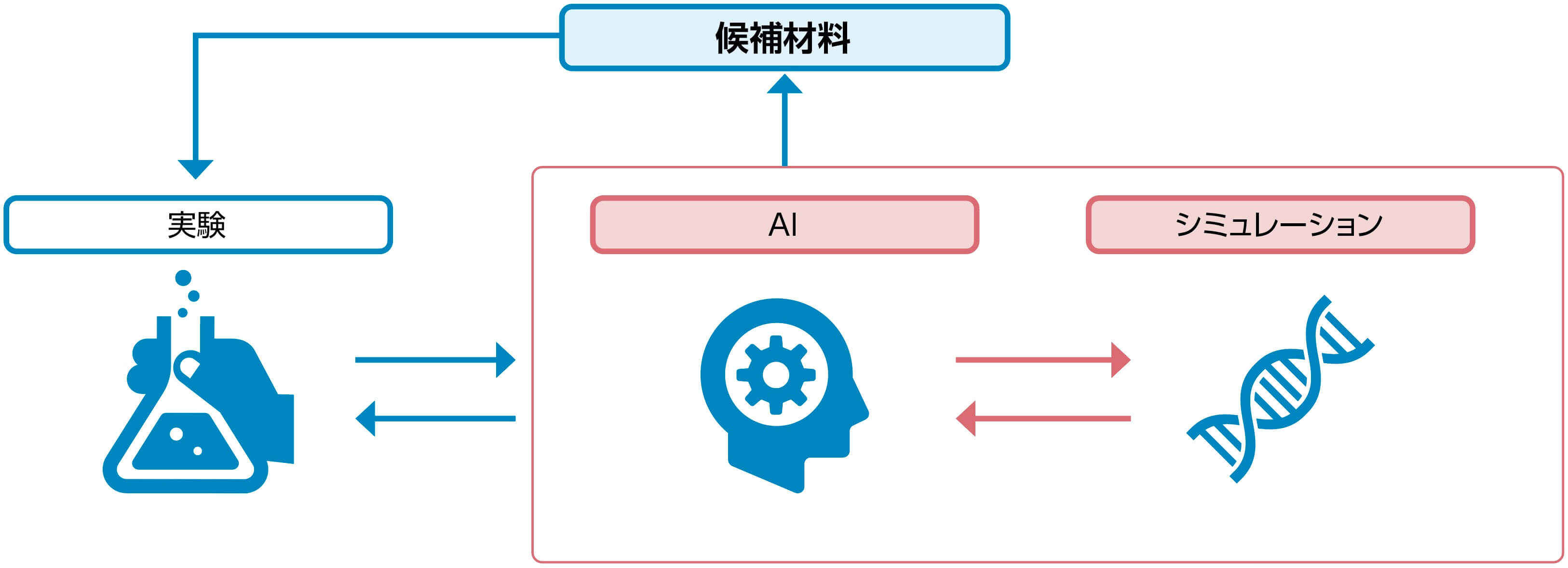 材料シミュレーションとAI、実験を連携した候補材料探索のイメージ